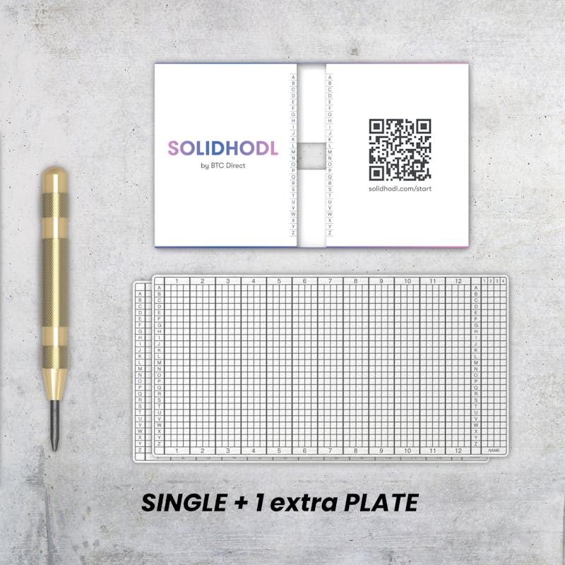 SOLIDHODL (SINGLE): 1 x SOLIDHODL-Platte 1 x Hülle (um Fehler zu vermeiden) 1 x Stanzer (zum Stanzen der Buchstaben in den Edelstahl)