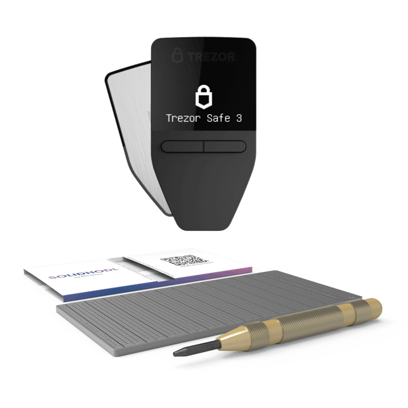 Schützen Sie Ihre Krypto mit der perfekten Kombination aus Trezor Safe 3 und SOLIDHODL. Verwenden Sie die Trezor Safe 3 Hardware-Wallet, um Ihre Krypto vor Hackern zu schützen. Kombinieren Sie dies mit SOLIDHODL, um ein Backup Ihrer 12, 20 oder 24-Wort-Wiederherstellungssatz zu erstellen, der feuer- und extrembedingungsbeständig ist. Zusammen schützen sie Ihr Krypto-Vermögen, damit Sie mit ruhigem Gewissen in Krypto investieren können.